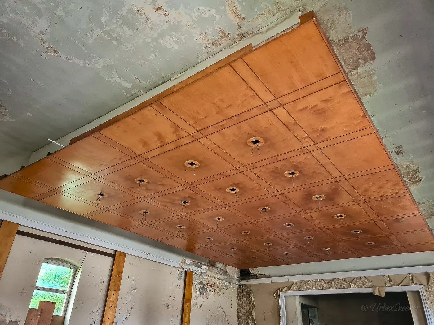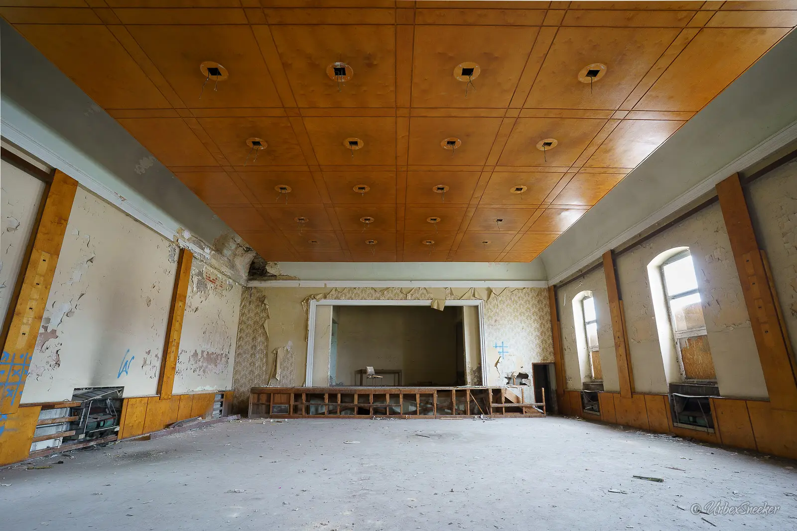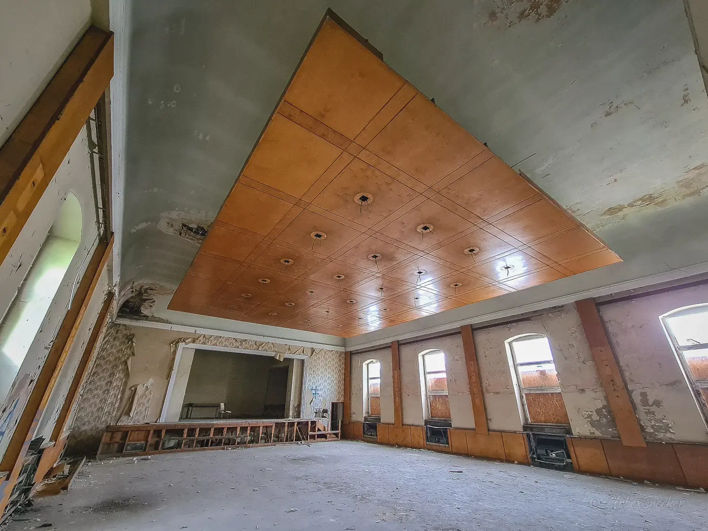 Ich habe ja wirklich schon viele verlassene Kulturhäuser und Gasthöfe mit Ballsaal bzw. Tanzsaal besucht, aber diese hängende Holzdecke war neu. Die original Decke ist ja die an den Wandseiten leicht abgerundete Decke. Offenbar wurde sie auch schon mehrfach übermalt. Mich hätte ja interesiert, wie die ursprüngliche Bemalung aussah. Oben von der Empore gegenüber der Bühne konnte ich mir einen guten Einblick in die angehängte Holzdecke verschaffen, die wohl einzig und allein der Beleuchtung diente. Vielleicht war das einfacher, als Stromkabel und Lampen in die original Decke zu verbauen. Vielleicht fand man es auch einfach nur schick. Leider wurde dieses verlassene Kulturhaus schon ziemlich ausgeschlachtet. Keine Heizkörper mehr im alten Tanzsaal, nirgends ein Möbelstück und die Lampen waren wohl besonders toll. Das verlassene Kulturhaus hat ausgedient. Den Tanzsaal fand ich trotzdem interessant.