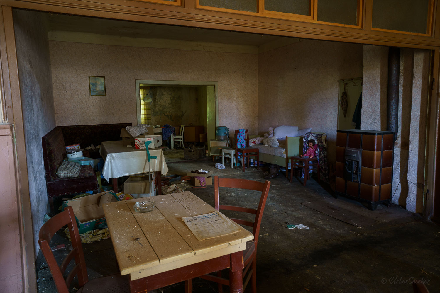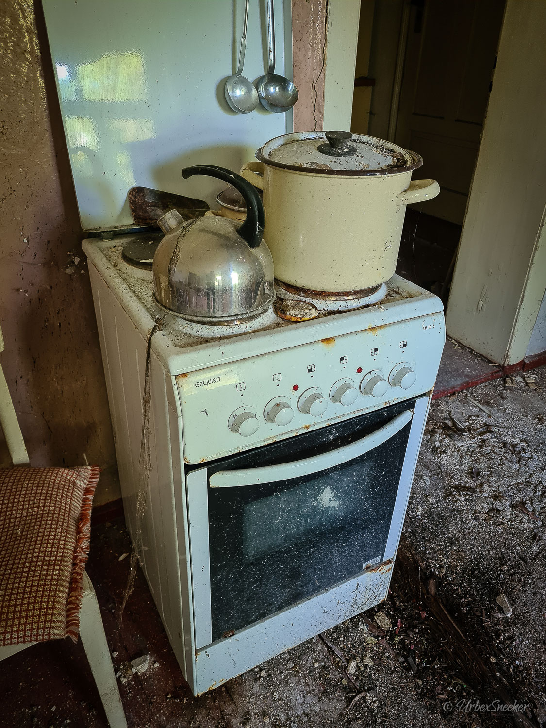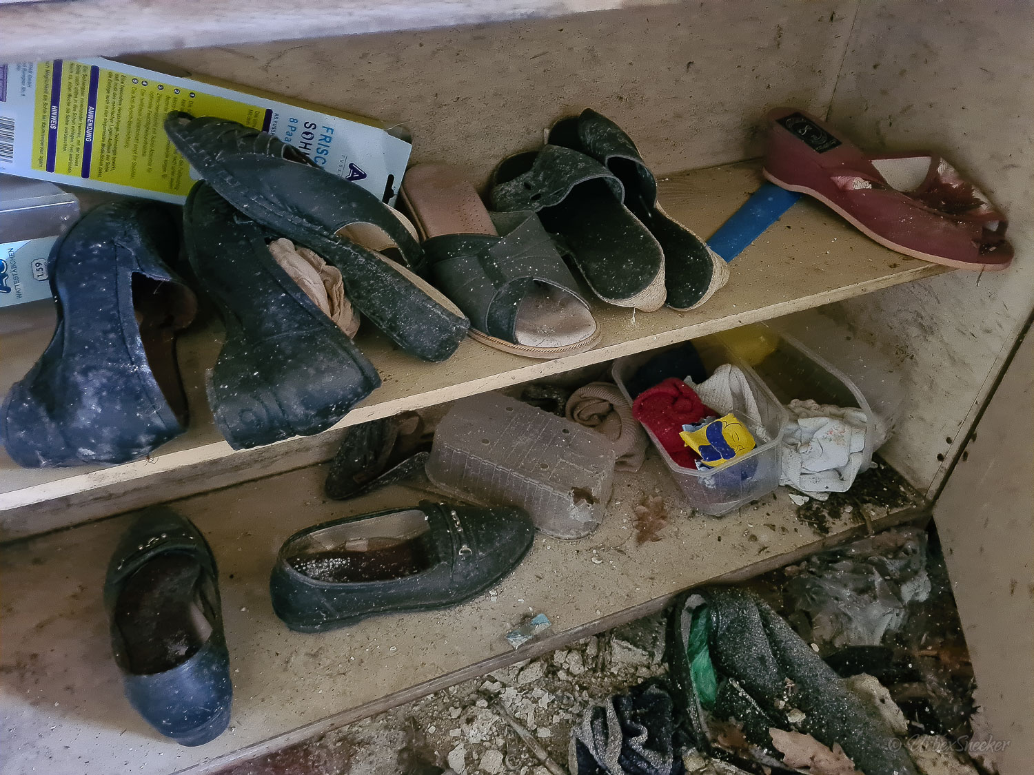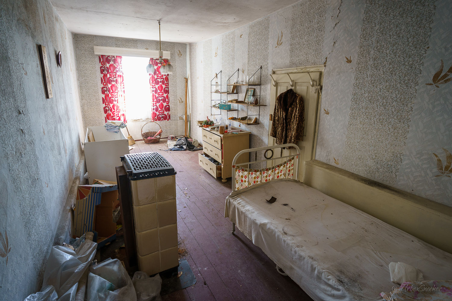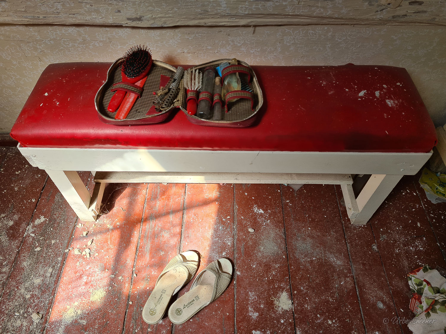 Dieser verlassene Ballsaal des alten Gasthofs aus den 1920gern war schon immer einer der Schönsten für mich. Erste Löcher in der wunderschönen Decke zeigen aber leider die bereits vorhandenen Schäden der Bausubstanz. Eingedrungenes Wasser wäscht bereits die Farbe aus den Raum-Ecken. Bruckteile der Stuckverzierung sind auch schon abgebrochen. Bei genauerer Betrachtung scheint es mir, dass es sich dabei gar nicht um Gips-Stuck handelt, sondern um Kunststoffteile, die nur aufgeklebt wurden. Egal, hat trotzdem seinen Zweck der schönen Zierde erfüllt. Dem angrenzenden Gaststättenraum sieht man auf den ersten Blick gar nicht unbedingt den Verfall des verlassenen Gasthofs an, nur das Drucheinander auf dem Thresen zeigt, dass irgendwelche Leute den Gasthof „durchwühlt“ hatten. Erstaunlich dabei finde ich immer, was so alles an Gegenständen zutage kommt, die keinen Bezug zueinander haben. Was machen Bügeleisen im Gastrobereich, und warum schleppt jemand, der alles durchwühlt, sie dahin?! Oder was hat ein Klammerbeutel in der Küche zu suchen? Beim Durchgehen der unteren Etage erlange ich den Eindruck, als wenn der oder die damaligen Besitzer gleich hinter dem Gatrobereich wohnten. Anders kann ich mir die Schlafcouch nicht erklären. Aber vielleicht waren das auch Unterkunftsräume. So ganz schlau werde ich aus der möglichen räumlichen Nutzung nicht. Eine ganz besondere „Zeitreise“ für mich ist die alte Küche im hinteren Teil des alten Gasthofs. Die Küchenschränke, Töpfe und der Teekessel erinnern mich an meine Kindheit, wenn ich bei Omma zu Besuch war. Auch die Puschen im Schuhschrank sind ganz klar die Mode von „Omma’s Generation“. Die kleine Reise in „Omma’s Zeiten“ geht im oberen Stockwerk weiter. Hier befand sich definitiv die private Wohnung. Ich stelle mir allerdings die Frage, wieso es hier noch ein Kinderbett mit Gitterstäben gibt, wenn der Rest der Möbel von einer Bewohnung schätzungsweise Anfang der 1970ger Jahre zeugt. Ein Kind wird ja älter und groß – hebt man weiterhin ein Kinderbettchen auf? Seltsam.