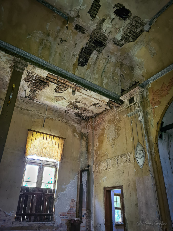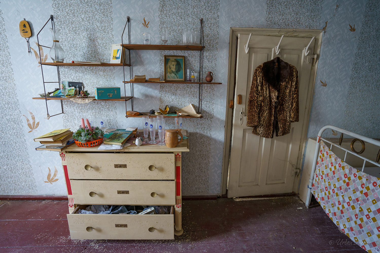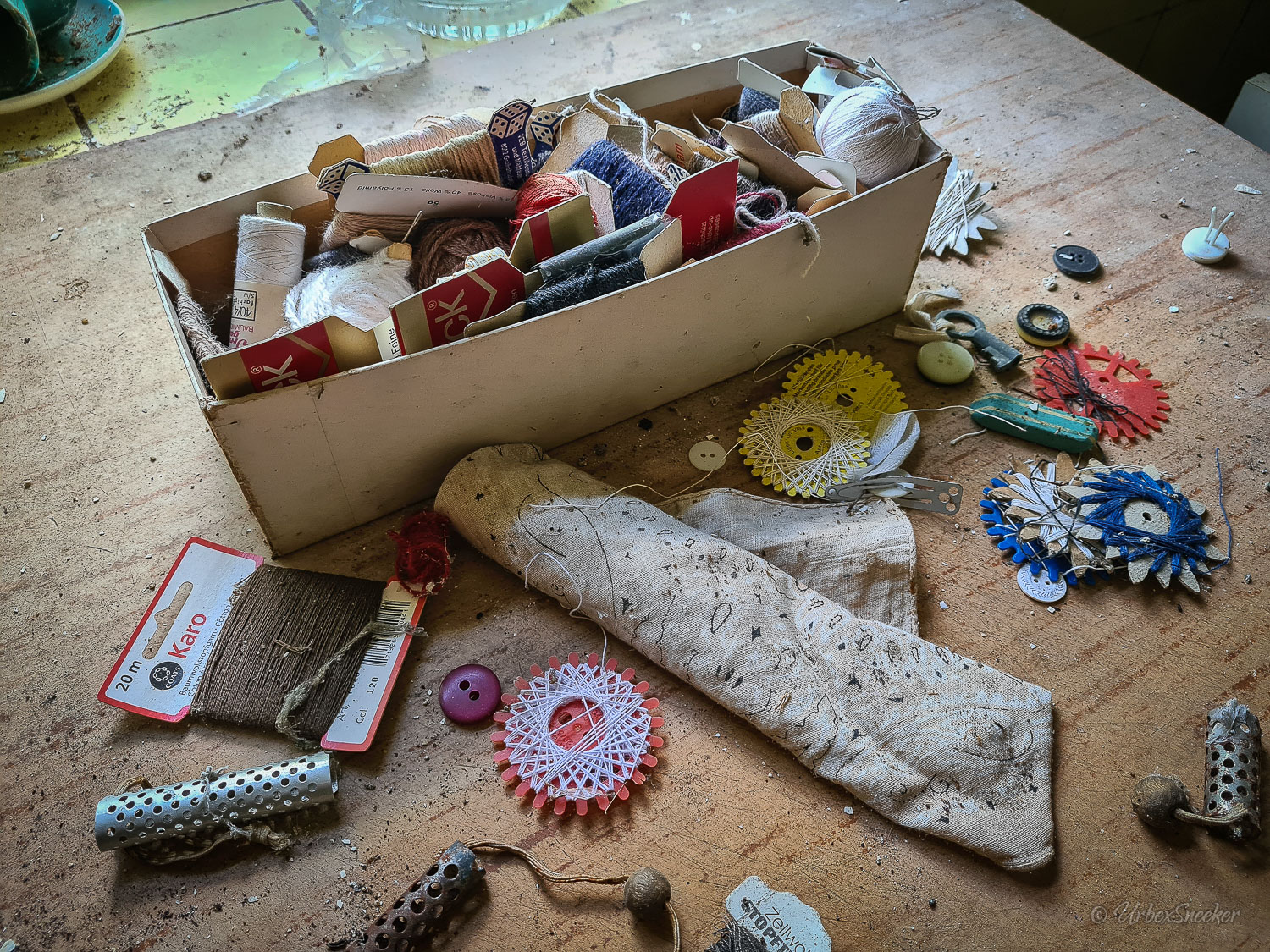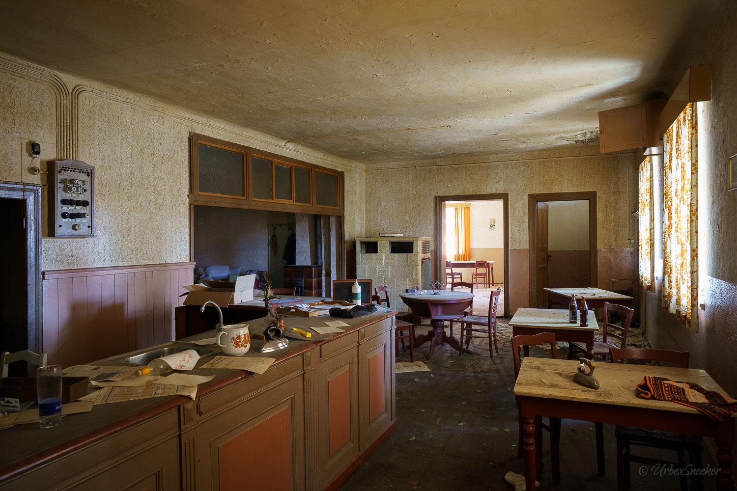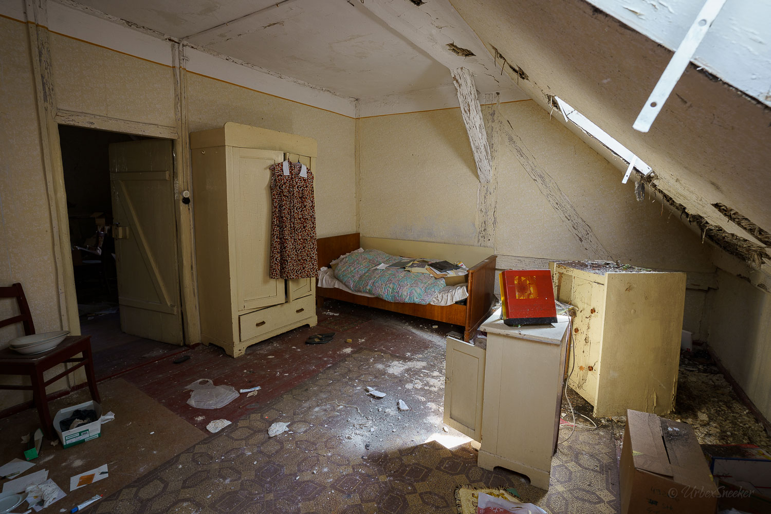 Dieser verlassene Ballsaal des alten Gasthofs aus den 1920gern war schon immer einer der Schönsten für mich. Erste Löcher in der wunderschönen Decke zeigen aber leider die bereits vorhandenen Schäden der Bausubstanz. Eingedrungenes Wasser wäscht bereits die Farbe aus den Raum-Ecken. Bruckteile der Stuckverzierung sind auch schon abgebrochen. Bei genauerer Betrachtung scheint es mir, dass es sich dabei gar nicht um Gips-Stuck handelt, sondern um Kunststoffteile, die nur aufgeklebt wurden. Egal, hat trotzdem seinen Zweck der schönen Zierde erfüllt. Dem angrenzenden Gaststättenraum sieht man auf den ersten Blick gar nicht unbedingt den Verfall des verlassenen Gasthofs an, nur das Drucheinander auf dem Thresen zeigt, dass irgendwelche Leute den Gasthof „durchwühlt“ hatten. Erstaunlich dabei finde ich immer, was so alles an Gegenständen zutage kommt, die keinen Bezug zueinander haben. Was machen Bügeleisen im Gastrobereich, und warum schleppt jemand, der alles durchwühlt, sie dahin?! Oder was hat ein Klammerbeutel in der Küche zu suchen? Beim Durchgehen der unteren Etage erlange ich den Eindruck, als wenn der oder die damaligen Besitzer gleich hinter dem Gatrobereich wohnten. Anders kann ich mir die Schlafcouch nicht erklären. Aber vielleicht waren das auch Unterkunftsräume. So ganz schlau werde ich aus der möglichen räumlichen Nutzung nicht. Eine ganz besondere „Zeitreise“ für mich ist die alte Küche im hinteren Teil des alten Gasthofs. Die Küchenschränke, Töpfe und der Teekessel erinnern mich an meine Kindheit, wenn ich bei Omma zu Besuch war. Auch die Puschen im Schuhschrank sind ganz klar die Mode von „Omma’s Generation“. Die kleine Reise in „Omma’s Zeiten“ geht im oberen Stockwerk weiter. Hier befand sich definitiv die private Wohnung. Ich stelle mir allerdings die Frage, wieso es hier noch ein Kinderbett mit Gitterstäben gibt, wenn der Rest der Möbel von einer Bewohnung schätzungsweise Anfang der 1970ger Jahre zeugt. Ein Kind wird ja älter und groß – hebt man weiterhin ein Kinderbettchen auf? Seltsam.