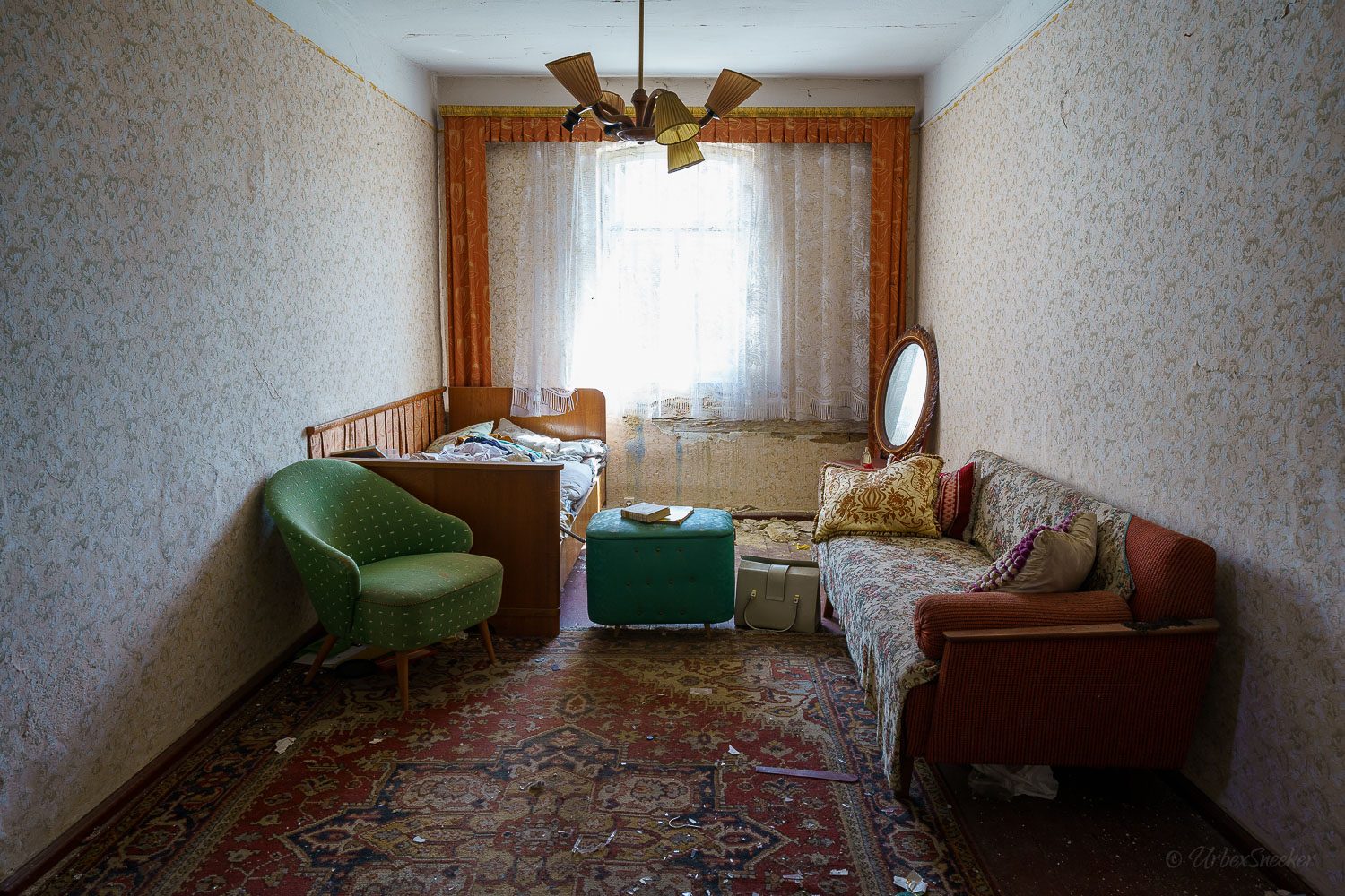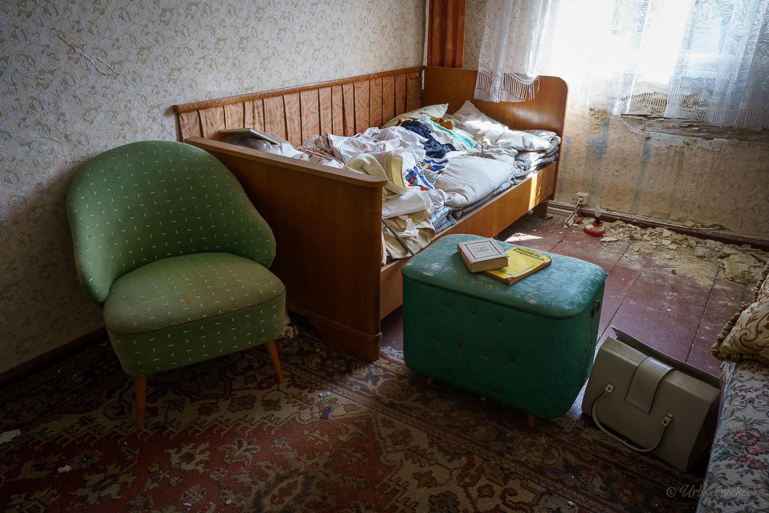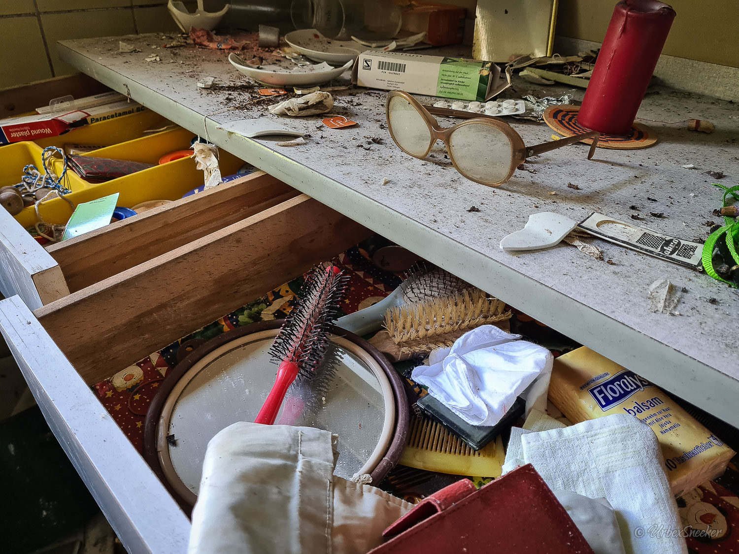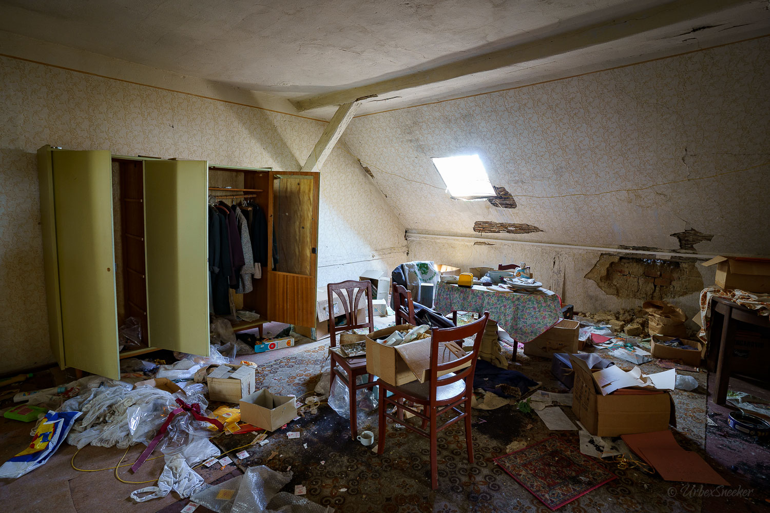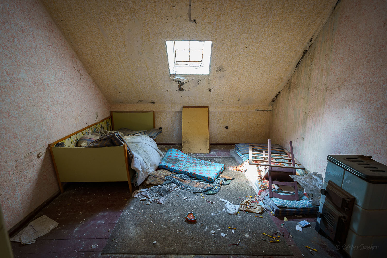 Dieser verlassene Ballsaal des alten Gasthofs aus den 1920gern war schon immer einer der Schönsten für mich. Erste Löcher in der wunderschönen Decke zeigen aber leider die bereits vorhandenen Schäden der Bausubstanz. Eingedrungenes Wasser wäscht bereits die Farbe aus den Raum-Ecken. Bruckteile der Stuckverzierung sind auch schon abgebrochen. Bei genauerer Betrachtung scheint es mir, dass es sich dabei gar nicht um Gips-Stuck handelt, sondern um Kunststoffteile, die nur aufgeklebt wurden. Egal, hat trotzdem seinen Zweck der schönen Zierde erfüllt. Dem angrenzenden Gaststättenraum sieht man auf den ersten Blick gar nicht unbedingt den Verfall des verlassenen Gasthofs an, nur das Drucheinander auf dem Thresen zeigt, dass irgendwelche Leute den Gasthof „durchwühlt“ hatten. Erstaunlich dabei finde ich immer, was so alles an Gegenständen zutage kommt, die keinen Bezug zueinander haben. Was machen Bügeleisen im Gastrobereich, und warum schleppt jemand, der alles durchwühlt, sie dahin?! Oder was hat ein Klammerbeutel in der Küche zu suchen? Beim Durchgehen der unteren Etage erlange ich den Eindruck, als wenn der oder die damaligen Besitzer gleich hinter dem Gatrobereich wohnten. Anders kann ich mir die Schlafcouch nicht erklären. Aber vielleicht waren das auch Unterkunftsräume. So ganz schlau werde ich aus der möglichen räumlichen Nutzung nicht. Eine ganz besondere „Zeitreise“ für mich ist die alte Küche im hinteren Teil des alten Gasthofs. Die Küchenschränke, Töpfe und der Teekessel erinnern mich an meine Kindheit, wenn ich bei Omma zu Besuch war. Auch die Puschen im Schuhschrank sind ganz klar die Mode von „Omma’s Generation“. Die kleine Reise in „Omma’s Zeiten“ geht im oberen Stockwerk weiter. Hier befand sich definitiv die private Wohnung. Ich stelle mir allerdings die Frage, wieso es hier noch ein Kinderbett mit Gitterstäben gibt, wenn der Rest der Möbel von einer Bewohnung schätzungsweise Anfang der 1970ger Jahre zeugt. Ein Kind wird ja älter und groß – hebt man weiterhin ein Kinderbettchen auf? Seltsam.