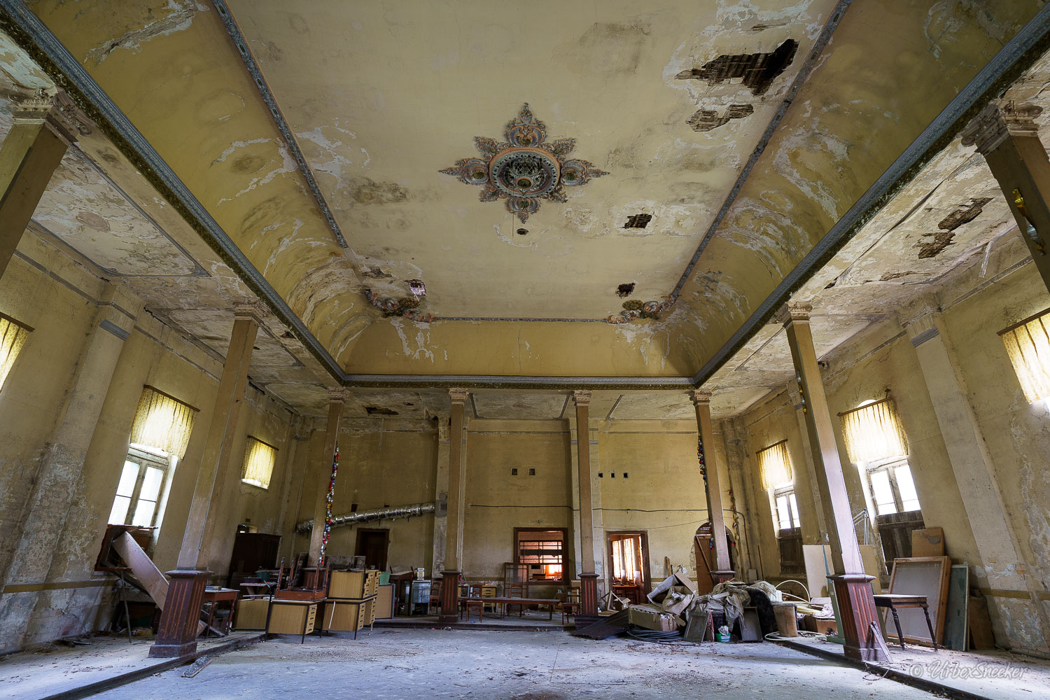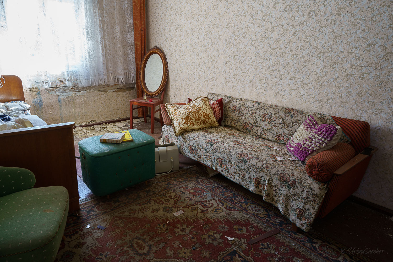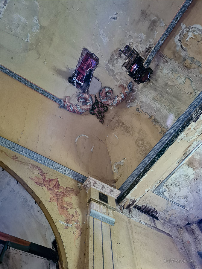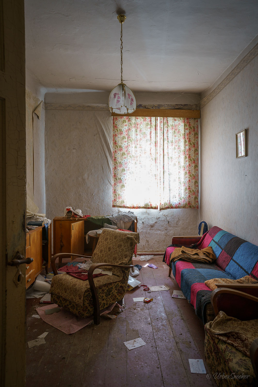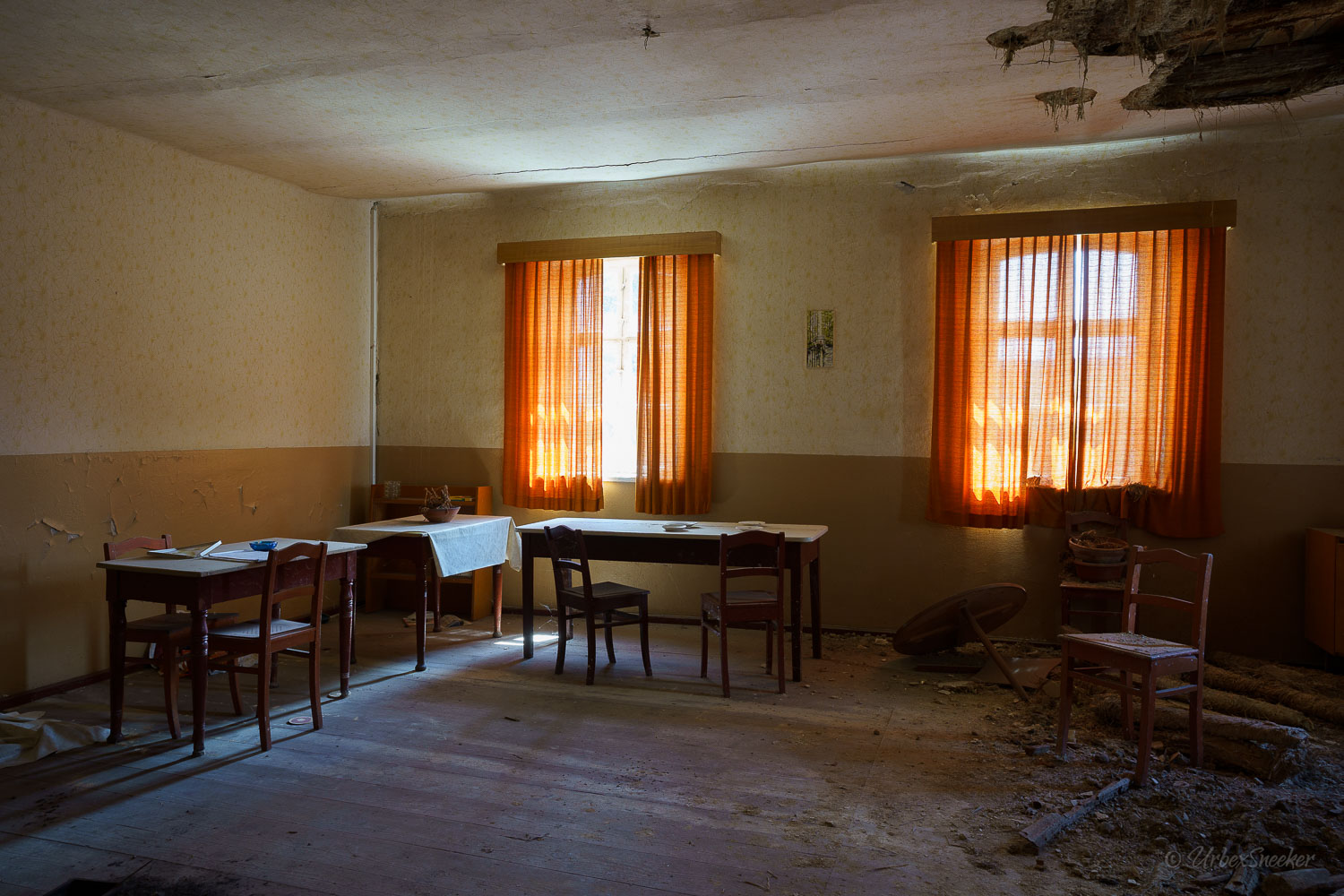 Dieser verlassene Ballsaal des alten Gasthofs aus den 1920gern war schon immer einer der Schönsten für mich. Erste Löcher in der wunderschönen Decke zeigen aber leider die bereits vorhandenen Schäden der Bausubstanz. Eingedrungenes Wasser wäscht bereits die Farbe aus den Raum-Ecken. Bruckteile der Stuckverzierung sind auch schon abgebrochen. Bei genauerer Betrachtung scheint es mir, dass es sich dabei gar nicht um Gips-Stuck handelt, sondern um Kunststoffteile, die nur aufgeklebt wurden. Egal, hat trotzdem seinen Zweck der schönen Zierde erfüllt. Dem angrenzenden Gaststättenraum sieht man auf den ersten Blick gar nicht unbedingt den Verfall des verlassenen Gasthofs an, nur das Drucheinander auf dem Thresen zeigt, dass irgendwelche Leute den Gasthof „durchwühlt“ hatten. Erstaunlich dabei finde ich immer, was so alles an Gegenständen zutage kommt, die keinen Bezug zueinander haben. Was machen Bügeleisen im Gastrobereich, und warum schleppt jemand, der alles durchwühlt, sie dahin?! Oder was hat ein Klammerbeutel in der Küche zu suchen? Beim Durchgehen der unteren Etage erlange ich den Eindruck, als wenn der oder die damaligen Besitzer gleich hinter dem Gatrobereich wohnten. Anders kann ich mir die Schlafcouch nicht erklären. Aber vielleicht waren das auch Unterkunftsräume. So ganz schlau werde ich aus der möglichen räumlichen Nutzung nicht. Eine ganz besondere „Zeitreise“ für mich ist die alte Küche im hinteren Teil des alten Gasthofs. Die Küchenschränke, Töpfe und der Teekessel erinnern mich an meine Kindheit, wenn ich bei Omma zu Besuch war. Auch die Puschen im Schuhschrank sind ganz klar die Mode von „Omma’s Generation“. Die kleine Reise in „Omma’s Zeiten“ geht im oberen Stockwerk weiter. Hier befand sich definitiv die private Wohnung. Ich stelle mir allerdings die Frage, wieso es hier noch ein Kinderbett mit Gitterstäben gibt, wenn der Rest der Möbel von einer Bewohnung schätzungsweise Anfang der 1970ger Jahre zeugt. Ein Kind wird ja älter und groß – hebt man weiterhin ein Kinderbettchen auf? Seltsam.