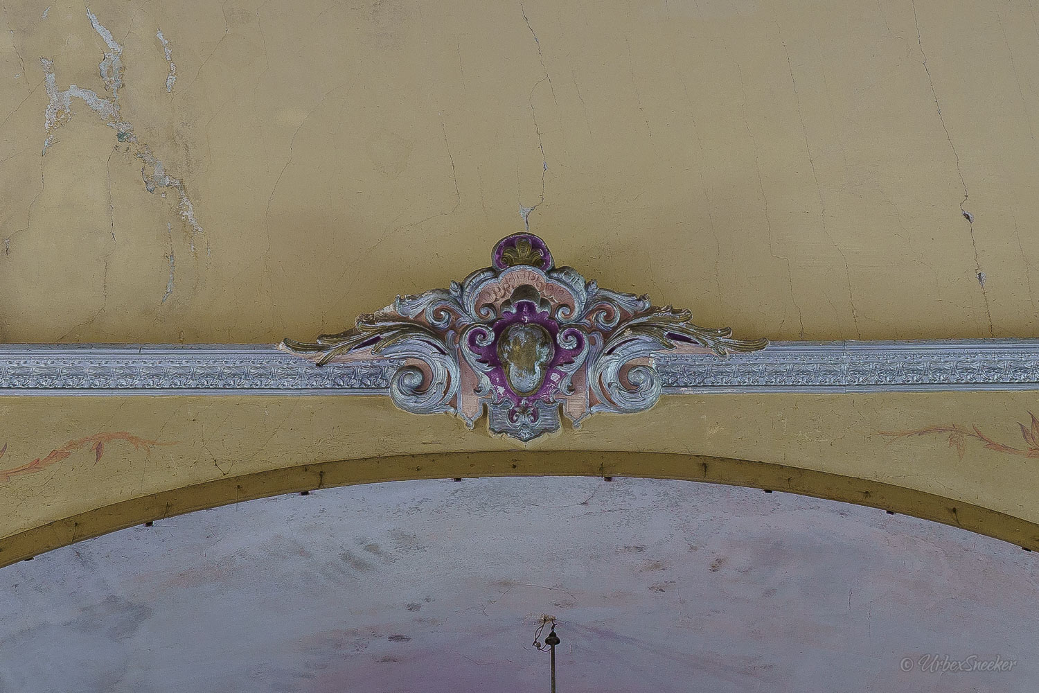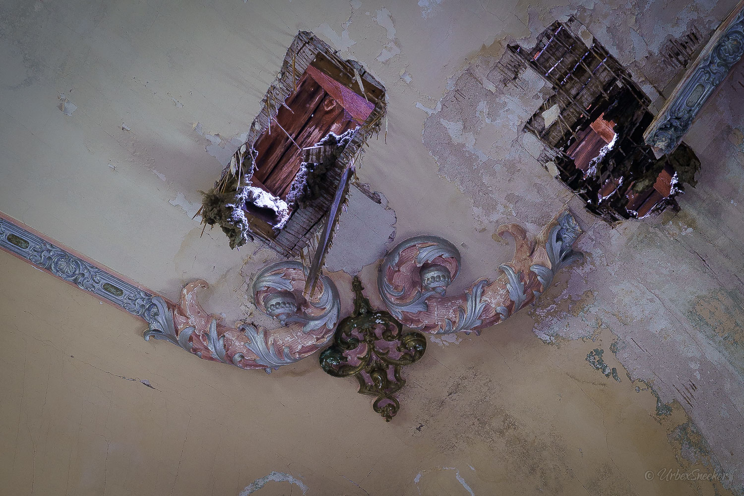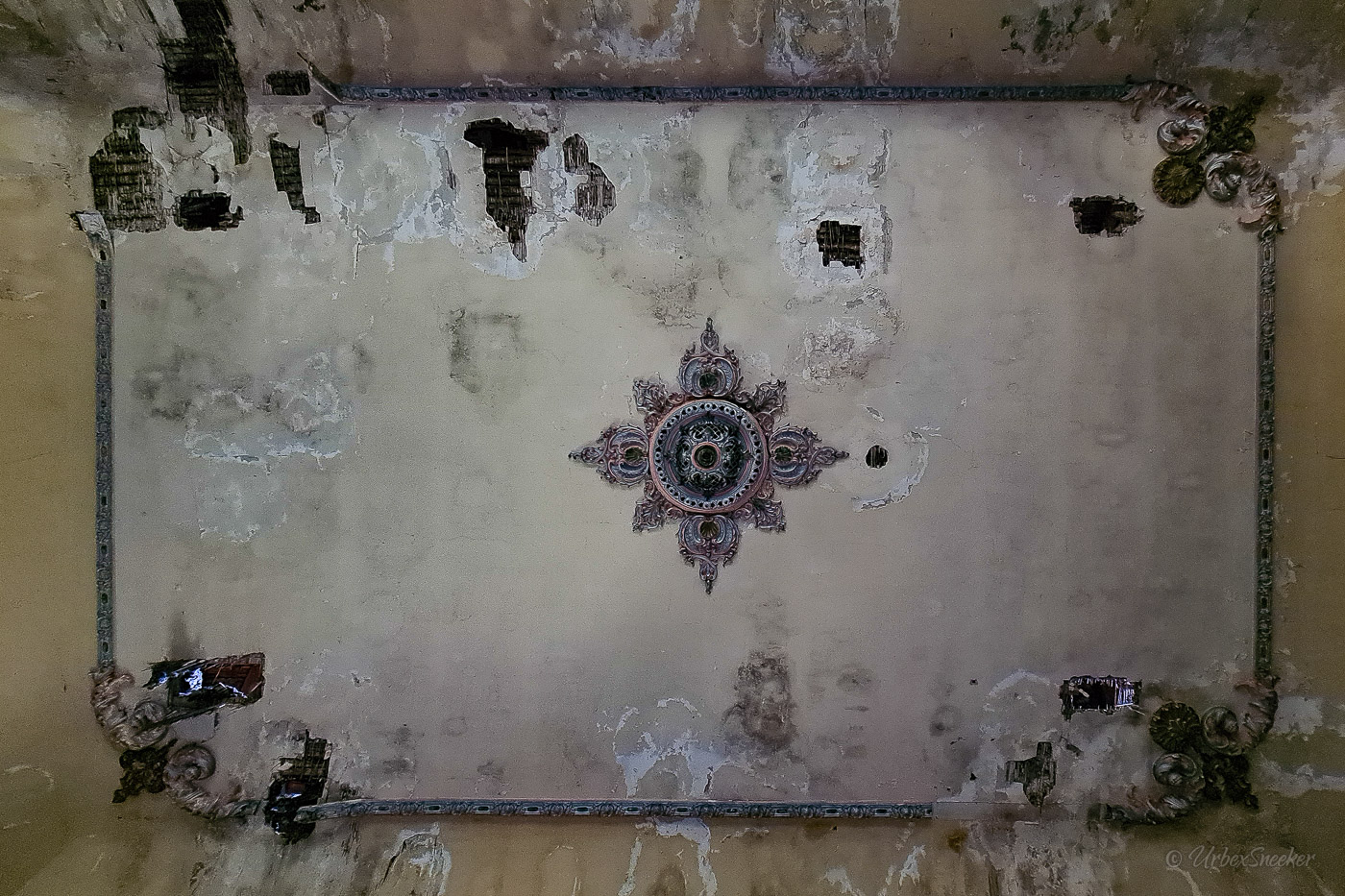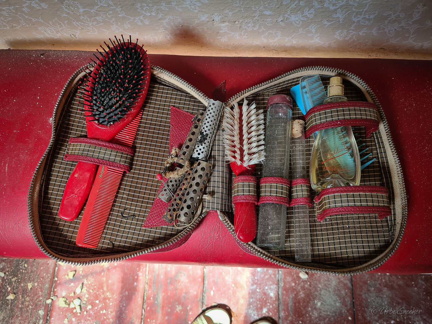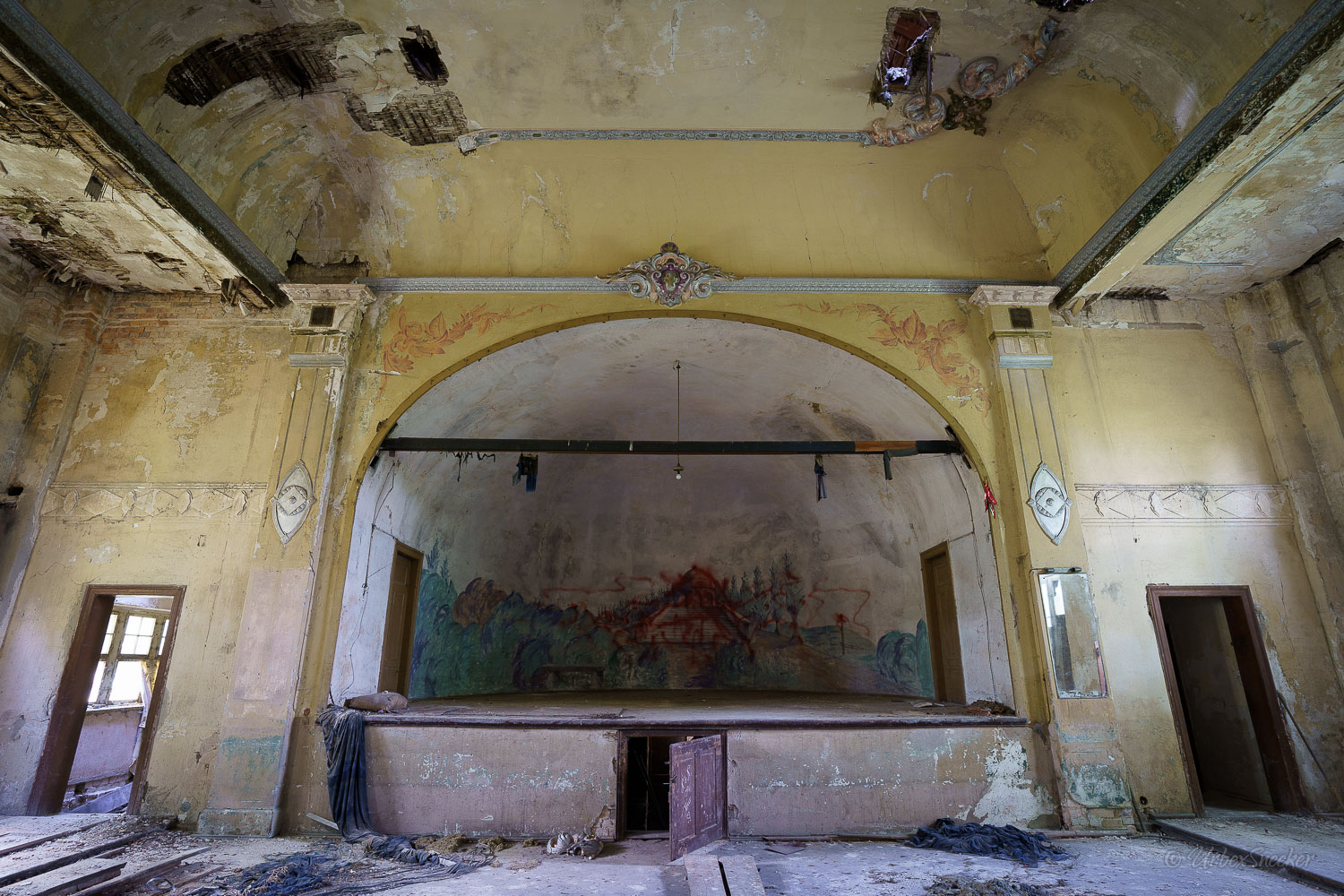 Dieser verlassene Ballsaal des alten Gasthofs aus den 1920gern war schon immer einer der Schönsten für mich. Erste Löcher in der wunderschönen Decke zeigen aber leider die bereits vorhandenen Schäden der Bausubstanz. Eingedrungenes Wasser wäscht bereits die Farbe aus den Raum-Ecken. Bruckteile der Stuckverzierung sind auch schon abgebrochen. Bei genauerer Betrachtung scheint es mir, dass es sich dabei gar nicht um Gips-Stuck handelt, sondern um Kunststoffteile, die nur aufgeklebt wurden. Egal, hat trotzdem seinen Zweck der schönen Zierde erfüllt. Dem angrenzenden Gaststättenraum sieht man auf den ersten Blick gar nicht unbedingt den Verfall des verlassenen Gasthofs an, nur das Drucheinander auf dem Thresen zeigt, dass irgendwelche Leute den Gasthof „durchwühlt“ hatten. Erstaunlich dabei finde ich immer, was so alles an Gegenständen zutage kommt, die keinen Bezug zueinander haben. Was machen Bügeleisen im Gastrobereich, und warum schleppt jemand, der alles durchwühlt, sie dahin?! Oder was hat ein Klammerbeutel in der Küche zu suchen? Beim Durchgehen der unteren Etage erlange ich den Eindruck, als wenn der oder die damaligen Besitzer gleich hinter dem Gatrobereich wohnten. Anders kann ich mir die Schlafcouch nicht erklären. Aber vielleicht waren das auch Unterkunftsräume. So ganz schlau werde ich aus der möglichen räumlichen Nutzung nicht. Eine ganz besondere „Zeitreise“ für mich ist die alte Küche im hinteren Teil des alten Gasthofs. Die Küchenschränke, Töpfe und der Teekessel erinnern mich an meine Kindheit, wenn ich bei Omma zu Besuch war. Auch die Puschen im Schuhschrank sind ganz klar die Mode von „Omma’s Generation“. Die kleine Reise in „Omma’s Zeiten“ geht im oberen Stockwerk weiter. Hier befand sich definitiv die private Wohnung. Ich stelle mir allerdings die Frage, wieso es hier noch ein Kinderbett mit Gitterstäben gibt, wenn der Rest der Möbel von einer Bewohnung schätzungsweise Anfang der 1970ger Jahre zeugt. Ein Kind wird ja älter und groß – hebt man weiterhin ein Kinderbettchen auf? Seltsam.