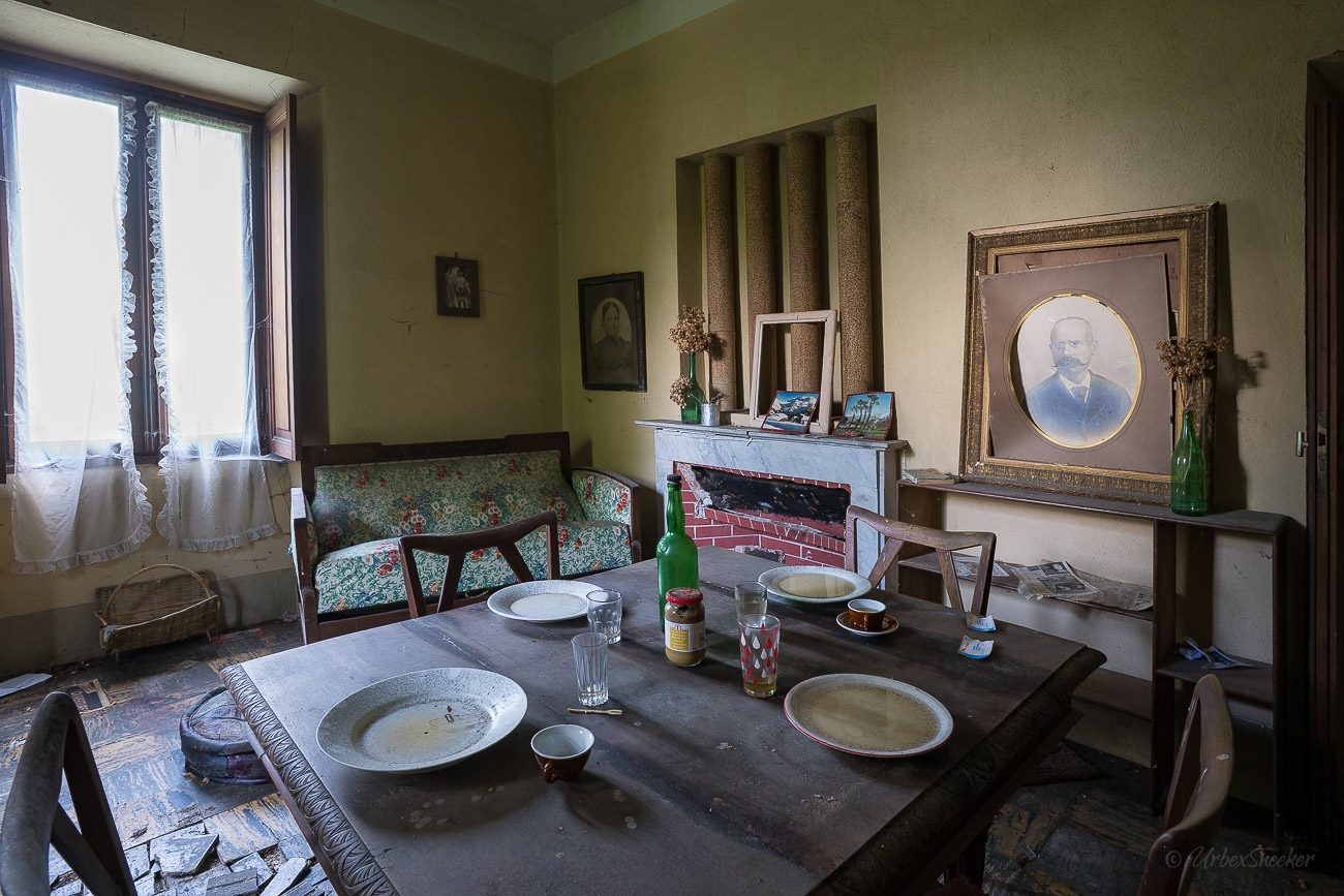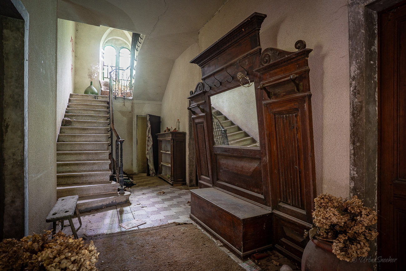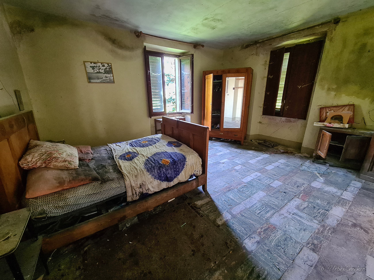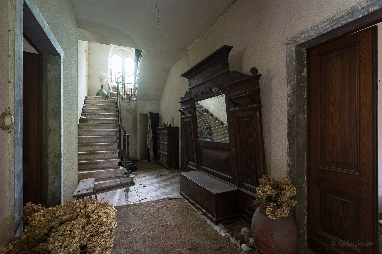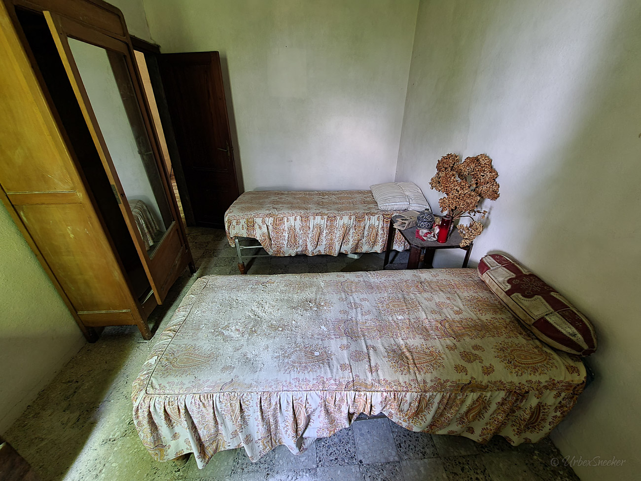 „Wie man wohl in Italien so wohnt und lebt?“, habe ich mich gefragt. Damit meine ich keinen Wohnraum umgeben von Prunk und Pracht, sondern wie sieht es in einem „normal“ bürgerlichen Haus aus? Wobei allerdings diese verlassene Villa auch nicht gerade klein ist, aber definitiv keine dicke Villa von reichen Leute wie die schöne Villa Pallavicino oder die verlassene Villa Becker. Mit Spannung nähere ich mich der Villa, zu der man ausgerrechnet über eine große, frei einsehbare Wiese gehen muss. Was soll’s, ich rechnete nicht damit, dass die davor parktenden LKW-Fahrer an mir interessiert sein würden. Zu meiner Überraschung steht die Haustür offen. Beim Eintreten fällt mein Blick mit einem „Aaahw“ im Kopf sofort auf die wunderschöne Garderobe. Gleichzeitig erhalte ich durch die getrockneten Ballhortensien in den großen Tonkrügen ein intensives Gefühl von persönlicher Atmosphäre, denn sie vermitteln mir den Eindruck von nett dekoriertem „Zuhause“. Ich schaue mich langsam um und versuche herauszufinden, wieviel Personen hier wohl gelebt haben und wie lange. Letzteres würde man an modernen Möbeln oder Elektronikgeräten erkennen können, aber erstaunlicherweise findet sich nichts dergleichen. Mir ist natürlich klar, dass die Räume – speziell Küche und Wohnraum – nicht in ihrem Originalzustand des Verlassens dieser Villa befinden. Ich bin ja (leider) nicht die Erste, die diese Villa besucht, und es gibt (leider, leider) immer Leute, die irgendetwas „dekorieren“ müssen. Aber es herrscht kein Quaos, es gibt keinen Vandalismus, somit scheint der Zustand noch recht ursprünglich. Dennoch wundert es mich dass ich wenig persönliche Sachen finde. Zum Beispiel Zeitungen, Strickzeug oder irgendwas für ein Hobby oder eine Beschäftigung nach Feierabend. Nur in dem Schlafraum mit dem Einzelbett finde ich eine Mappe mit Zeichnungen und Malereien. Das Hobby hatte ich auch mal, damals, als es noch keine Smartphones und SozialMedia und diesen von vielen Menschen für selbstverständlich gehaltenen Wohlstand gab. Nichts davon hat mich vom Malen weggebracht, ich bin statt dessen intensiv in die Fotografie und das Urbexen eingetaucht. Zum Glück und wie schön! Aber auch einen Fotoapparat habe ich hier nicht gefunden. Nun gut, die waren damals sicherlich eher „Luxus“. Während ich noch am Auskundschaften bin, kommt ein italienisches Pärchen Mitte 30J. Sie beschäftigen sich mit paranormalen Phänomen und wollen mal schauen, ob sie hier etwas „finden“. Aber bereits nach wenigen Minuten verschwinden sie wieder. Für mich bleibt am Ende immer noch eine Frage: „Wie hat man eigentlich in Italien so gelebt, damals, ohne Moderne?“