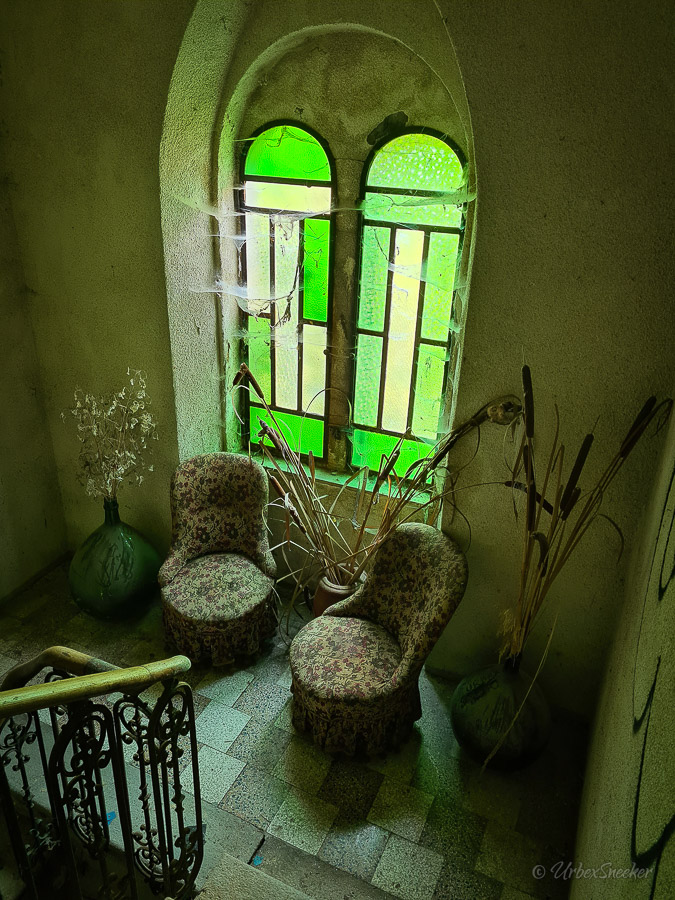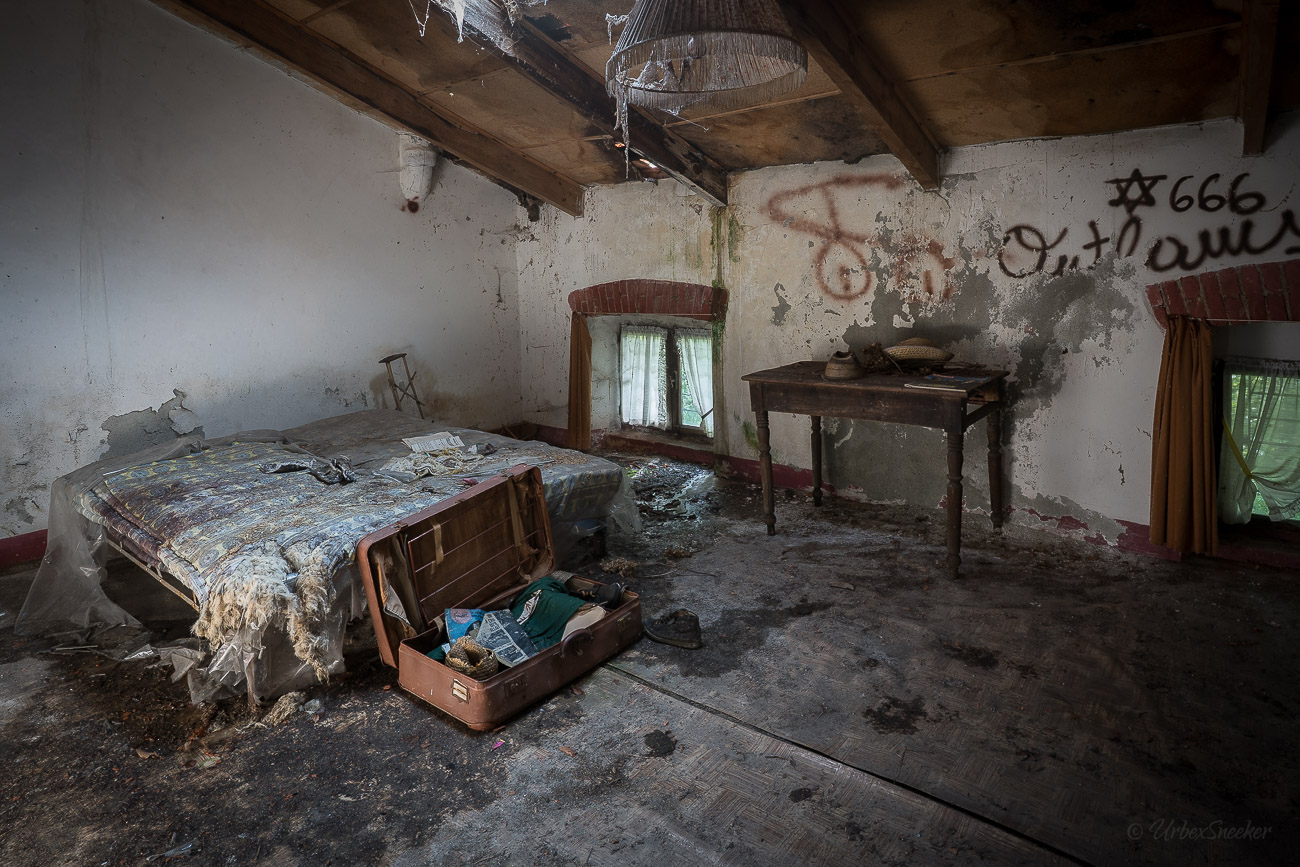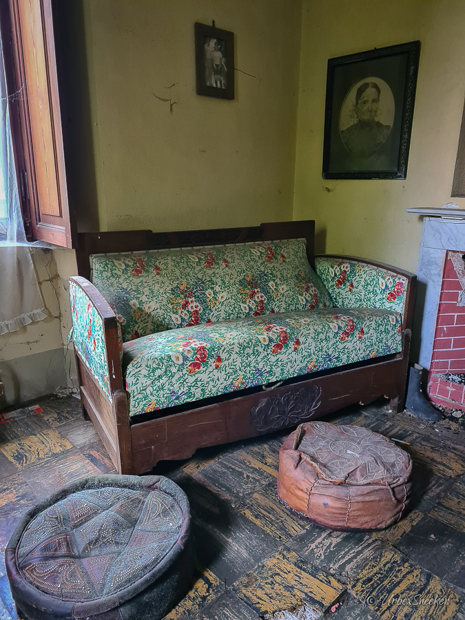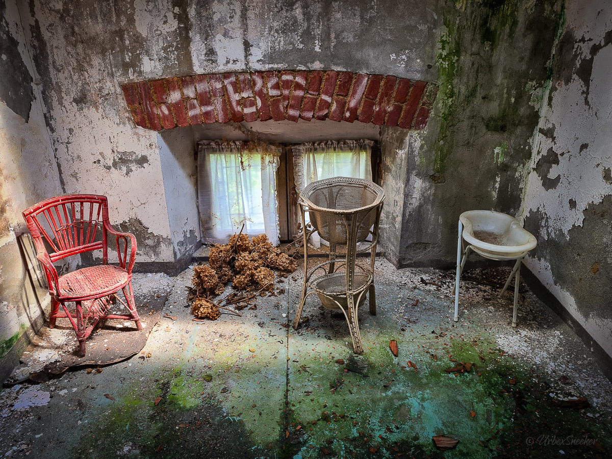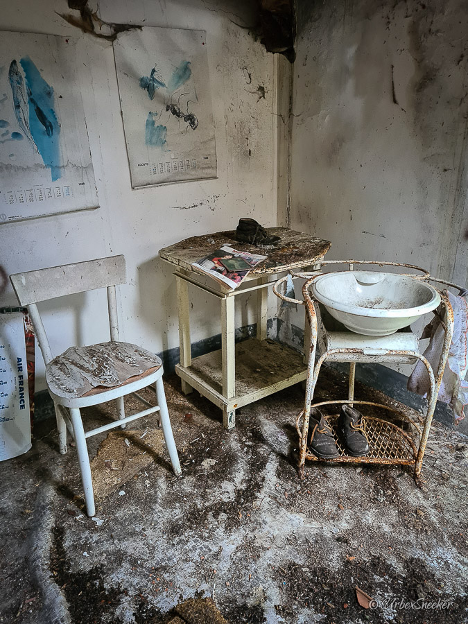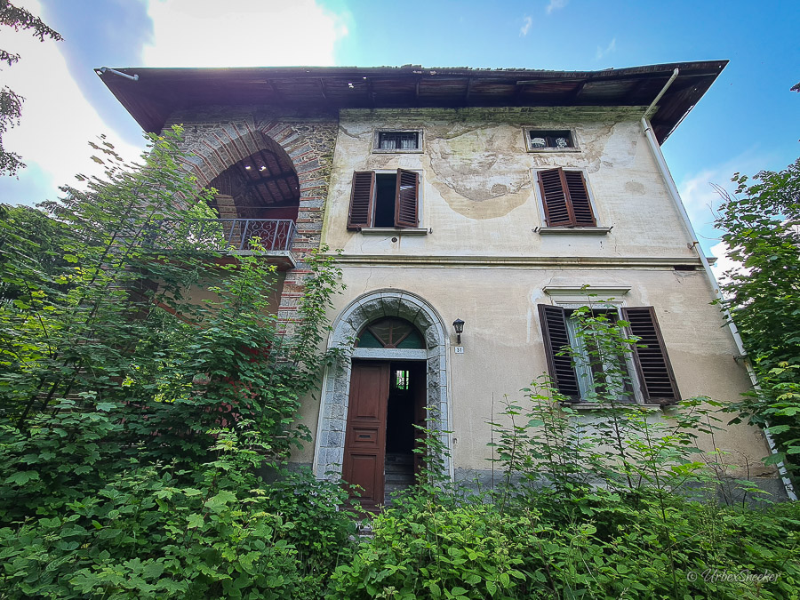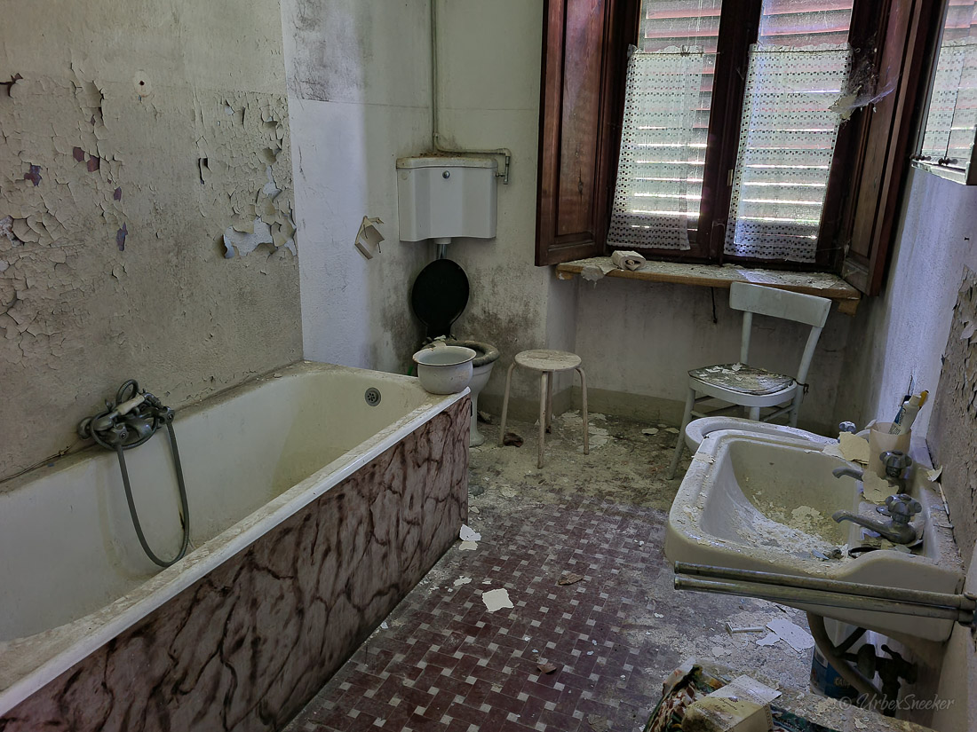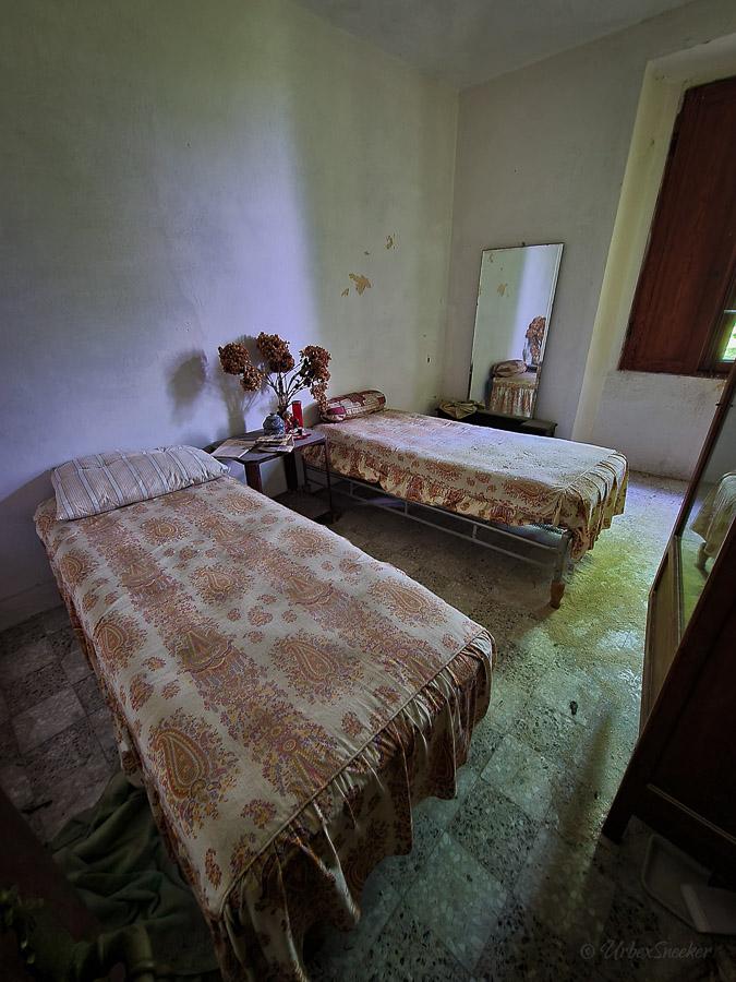 „Wie man wohl in Italien so wohnt und lebt?“, habe ich mich gefragt. Damit meine ich keinen Wohnraum umgeben von Prunk und Pracht, sondern wie sieht es in einem „normal“ bürgerlichen Haus aus? Wobei allerdings diese verlassene Villa auch nicht gerade klein ist, aber definitiv keine dicke Villa von reichen Leute wie die schöne Villa Pallavicino oder die verlassene Villa Becker. Mit Spannung nähere ich mich der Villa, zu der man ausgerrechnet über eine große, frei einsehbare Wiese gehen muss. Was soll’s, ich rechnete nicht damit, dass die davor parktenden LKW-Fahrer an mir interessiert sein würden. Zu meiner Überraschung steht die Haustür offen. Beim Eintreten fällt mein Blick mit einem „Aaahw“ im Kopf sofort auf die wunderschöne Garderobe. Gleichzeitig erhalte ich durch die getrockneten Ballhortensien in den großen Tonkrügen ein intensives Gefühl von persönlicher Atmosphäre, denn sie vermitteln mir den Eindruck von nett dekoriertem „Zuhause“. Ich schaue mich langsam um und versuche herauszufinden, wieviel Personen hier wohl gelebt haben und wie lange. Letzteres würde man an modernen Möbeln oder Elektronikgeräten erkennen können, aber erstaunlicherweise findet sich nichts dergleichen. Mir ist natürlich klar, dass die Räume – speziell Küche und Wohnraum – nicht in ihrem Originalzustand des Verlassens dieser Villa befinden. Ich bin ja (leider) nicht die Erste, die diese Villa besucht, und es gibt (leider, leider) immer Leute, die irgendetwas „dekorieren“ müssen. Aber es herrscht kein Quaos, es gibt keinen Vandalismus, somit scheint der Zustand noch recht ursprünglich. Dennoch wundert es mich dass ich wenig persönliche Sachen finde. Zum Beispiel Zeitungen, Strickzeug oder irgendwas für ein Hobby oder eine Beschäftigung nach Feierabend. Nur in dem Schlafraum mit dem Einzelbett finde ich eine Mappe mit Zeichnungen und Malereien. Das Hobby hatte ich auch mal, damals, als es noch keine Smartphones und SozialMedia und diesen von vielen Menschen für selbstverständlich gehaltenen Wohlstand gab. Nichts davon hat mich vom Malen weggebracht, ich bin statt dessen intensiv in die Fotografie und das Urbexen eingetaucht. Zum Glück und wie schön! Aber auch einen Fotoapparat habe ich hier nicht gefunden. Nun gut, die waren damals sicherlich eher „Luxus“. Während ich noch am Auskundschaften bin, kommt ein italienisches Pärchen Mitte 30J. Sie beschäftigen sich mit paranormalen Phänomen und wollen mal schauen, ob sie hier etwas „finden“. Aber bereits nach wenigen Minuten verschwinden sie wieder. Für mich bleibt am Ende immer noch eine Frage: „Wie hat man eigentlich in Italien so gelebt, damals, ohne Moderne?“